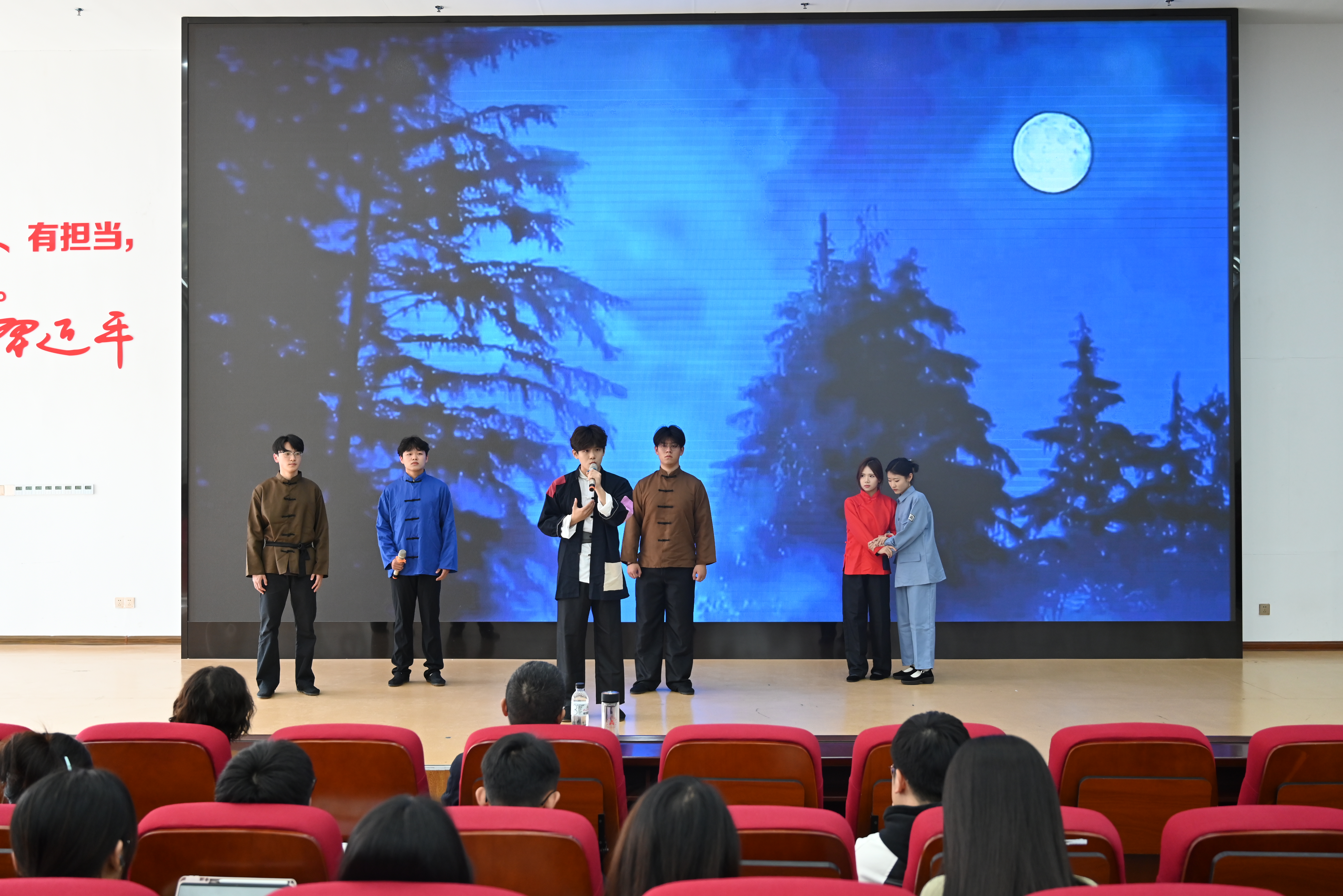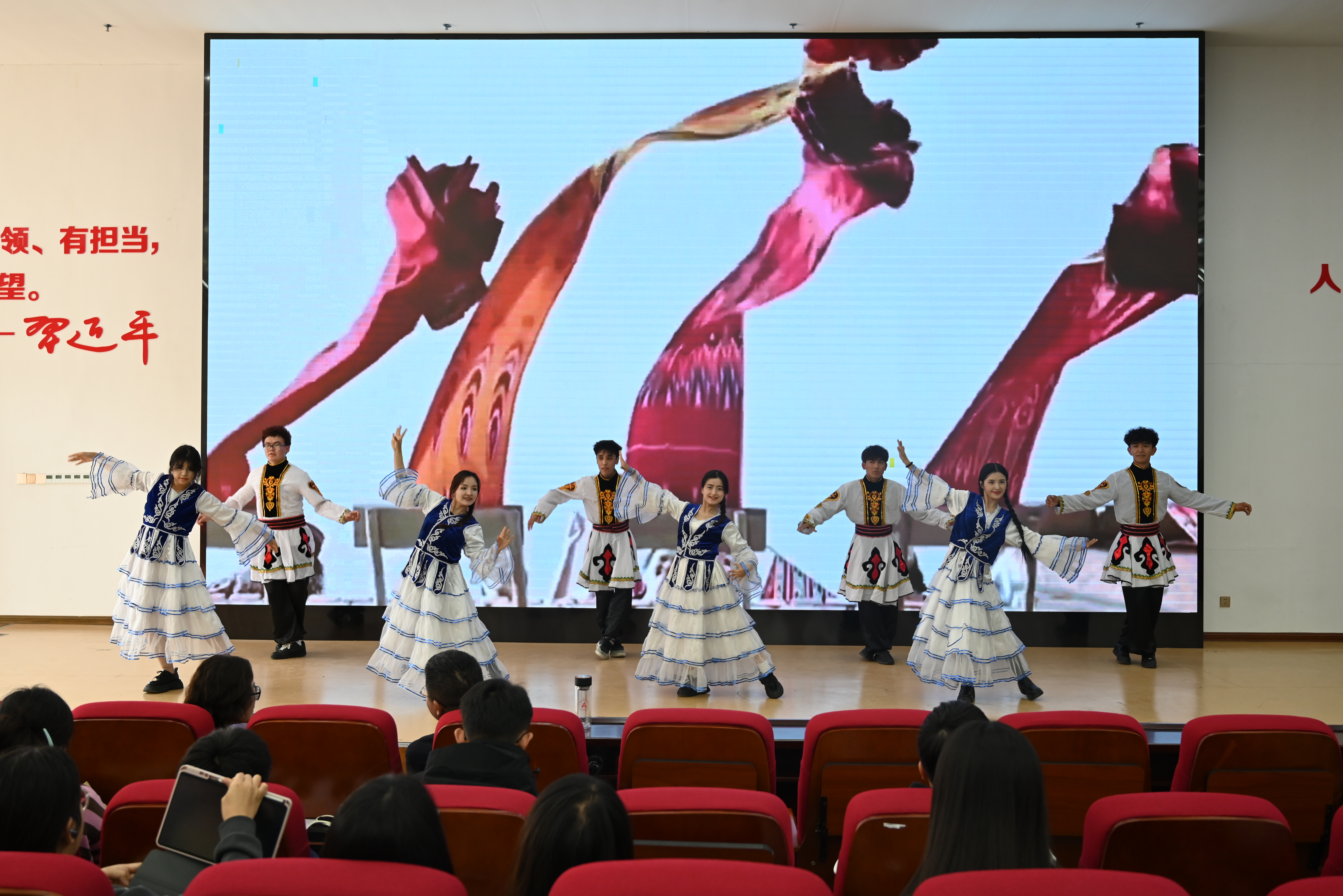本次党课由艺术学院表演团队带来了《长城谣》《黄河颂》《绒花》等10首红色歌曲和新疆顶碗舞、哈萨克舞等少数民族舞蹈,以沉浸式红色音乐赏析的形式,带领学生重温中国共产党百余年来波澜壮阔的光辉历程。演出人员倾情演绎,用悠扬婉转的旋律和优美灵动的舞姿传递出了革命岁月的筚路蓝缕,传递出了对党的热爱与感激,传递出了坚守真理、担当使命的崇高信仰。