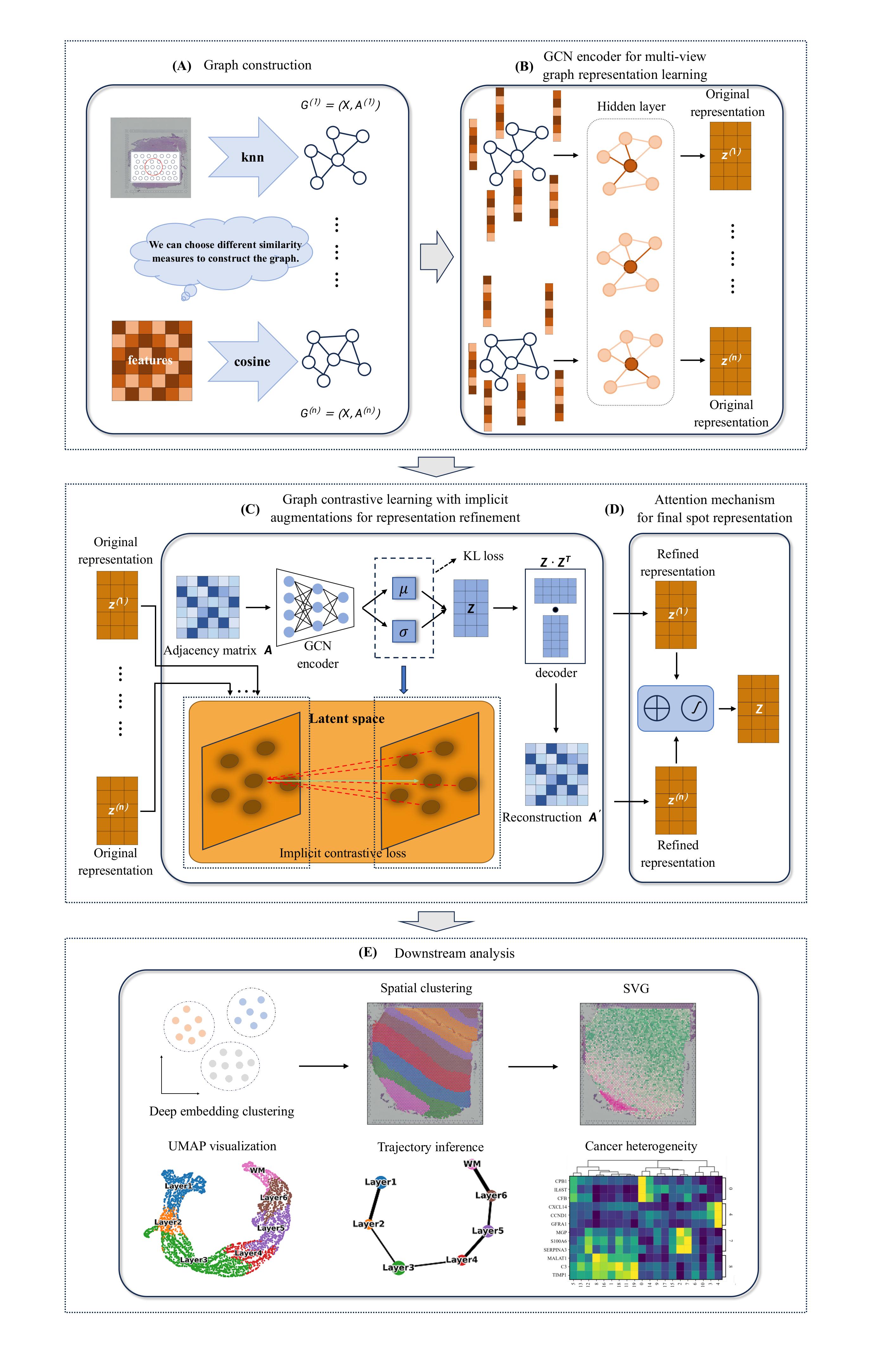 研究团队提出一种基于隐式对比学习的多视图图卷积网络框架,称为 STMIGCL。STMIGCL 借助空间转录组数据中的基因表达谱以及空间位置信息,运用不同的方法构建多个邻居图,依靠不同视图间的协同学习从数据中提取更为丰富且有效的信息。运用GCN学习每个视图的低维表示,实现图结构与基因表达特征的有效融合。通过将多视图学习与对比学习相结合,STMIGCL可充分利用GCN的独特优势深入挖掘每个视图中的潜在信息,还可以有效整合并利用不同视图之间的互补优势,获取更全面、丰富的信息。进一步利用基于隐式增强的对比学习方法,STMIGCL 显著增强表示的判别能力,优化聚类性能。为了捕捉不同视图嵌入的重要性,STMIGCL 运用注意力机制,自适应融合不同视图的潜在表示,得到最终的斑点表示。通过在多个不同技术平台获得的数据集中进行实验的结果表明,STMIGCL显著提升空间域的识别精度,在轨迹推断、空间可变基因识别等任务中优于现有基线方法。另外,通过在人类乳腺癌数据集上的实验分析结果表明,STMIGCL能够从更精细的层次剖析癌组织的异质性,为制定靶向治疗策略提供理论依据。